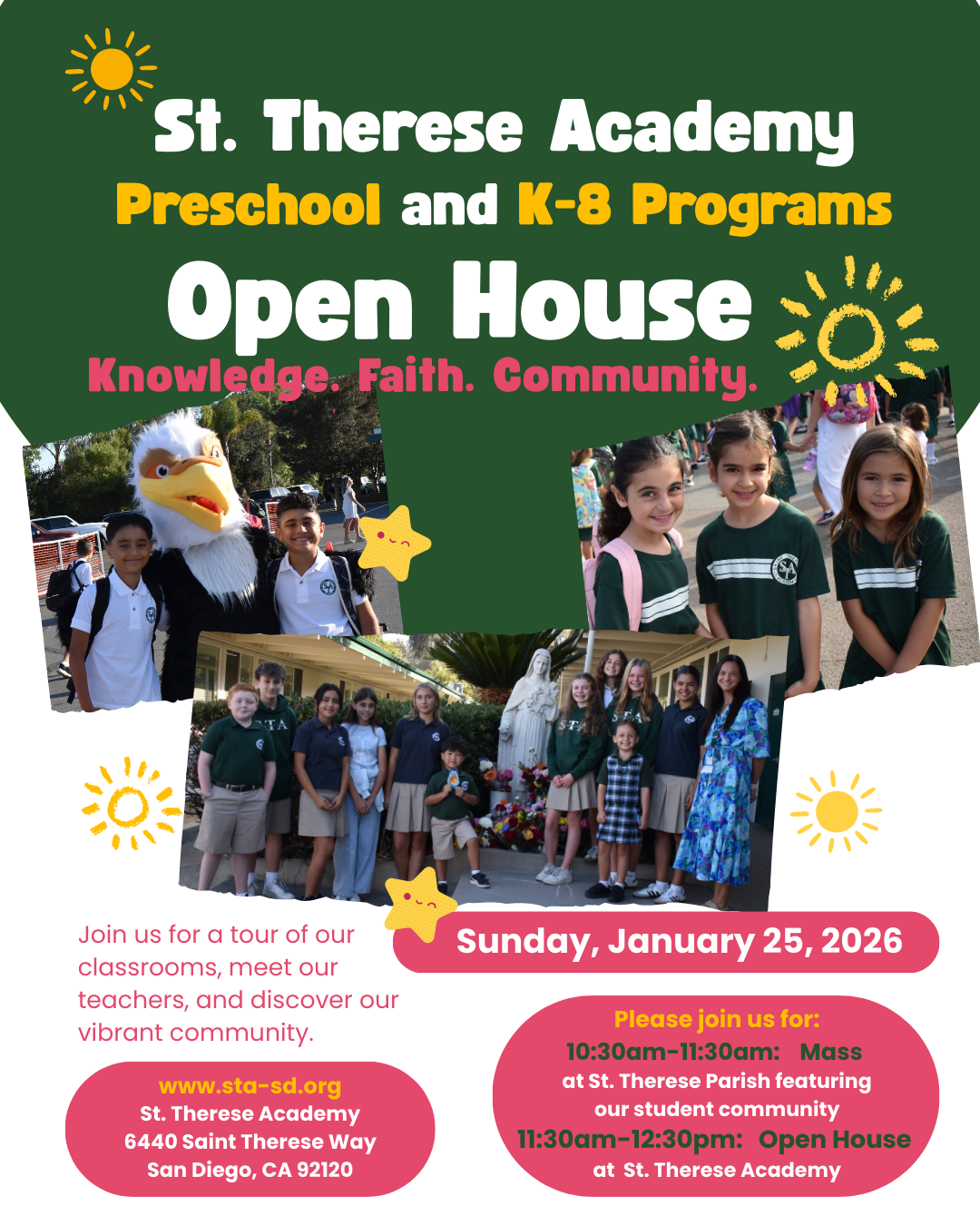 This is a wonderful opportunity to visit your Parish/neighborhood school and learn about the exciting things happening at St. Therese Academy. Join us for the St. Therese Parish 10:30 AM Mass. Afterwards, visit our school campus from 11:30-12:30. Meet our dedicated teachers and discover the quality education being offered to our students. Come and learn about the art, PE, Spanish, library and music programs we include in our curriculum. We are very proud of our school, and we are excited to share more information with you!